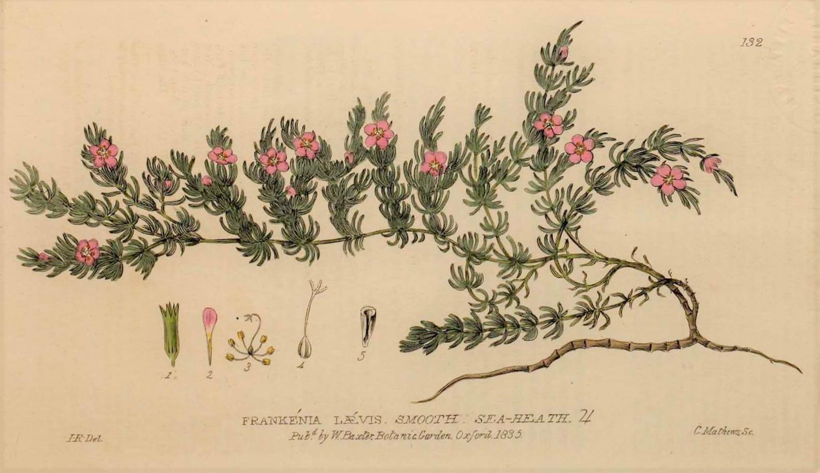FrankeniaceaeGénero nombrado en homenaje al botánico sueco Johan Frankenius, engloba a unas 90 especies de hierbas y arbustos halófilos. La F. laevis es una pequeña planta rastrera y tapizante perenne de pequeñas flores malva, que habita en los arenales y pedregales costeros, salinos y secos, de la costa atlántica desde Canarias y Azores hasta Gran Bretaña, y en el Mediterráneo desde España hasta Italia y en el Magreb.