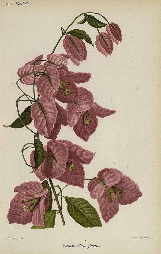 Hay diferentes especies de Buganvillas que pueblan jardines de todo el mundo: B. spectabilis, B. glabra, B. fulgens,... todas ellas con una evidente característica común: una floración exuberante. Como curiosidad, sus colores no se los otorgan las flores, sino las coloridas brácteas (hojas modificadas) que las rodean. Aunque el color más habitual es rosa (en diferentes tonalidades), hay variedades amarillas, naranjas, blancas, violetas, etc. En este siglo XVIII, España y Portugal, las potencias navales hasta entonces, perdieron el dominio de los mares a favor de Gran Bretaña y Francia. Al tiempo que se confirmaban como imperios coloniales, estas naciones llevaron a cabo una serie de importantes expediciones científicas que ampliaron el conocimiento del globo. Es la época de los viajes de James Cook por el Pacífico y el descubrimiento oficial de Australia y Nueva Zelanda del lado británico. Es el tiempo a su vez de la primera vuelta al mundo en barco realizada por Francia de la mano del mismo Bougainville.Procedencia